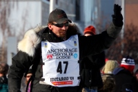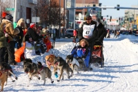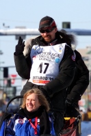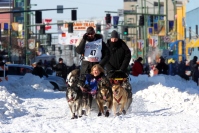 March 7, 2009: Lance Mackey with Honorary Rider at the Ceremonial race start downtown Anchorage. Winner of the 2007 & 2008 Iditarod, Lance Mackey has a lot at stake in this year's race. He could make History by winning Iditarod XXXVII, and sweep a triple victory in a row, joining Susan Butcher and Doug Swingley. All eyes are on Lance. |