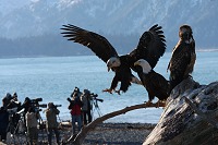 Bald Eagles fly by on-lookers on the board walk at Potter's Marsh, Anchorage.