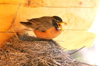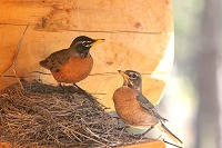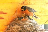 American Robins nesting under our log home roof in late Spring.