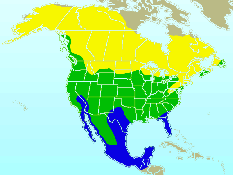 In late Summer, they fly back south where they spend the Winter (blue and green on the map).