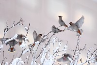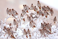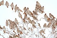 A flock of Bohemian Waxwings in the dead of the winter. They congregate in large flocks and eat berries on frozen trees.