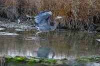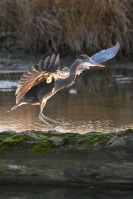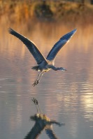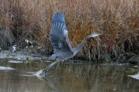The sunset is casting an orange light on the marsh, creating a beautiful backdrop for our Blue Heron taking off.