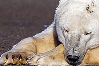 Polar Bear on a sunny day. In this close up picture, a Polar Bear relaxes his head above his huge claws.