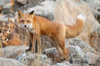 It's late in the afternoon in September, and the sun will soon set under the horizon. This Red Fox suddenly peeks at us from behind a rock and