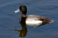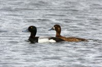 the Lesser Scaup. The Greater Scaup is larger, with a wingspan around 75 cm. Males have a black head with a greenish sheen, while females have light brown feathers. They have a blue bill and yellow eyes. |