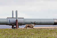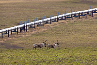 Caribou roaming the Arctic tundra along the Trans Alaska Pipeline.