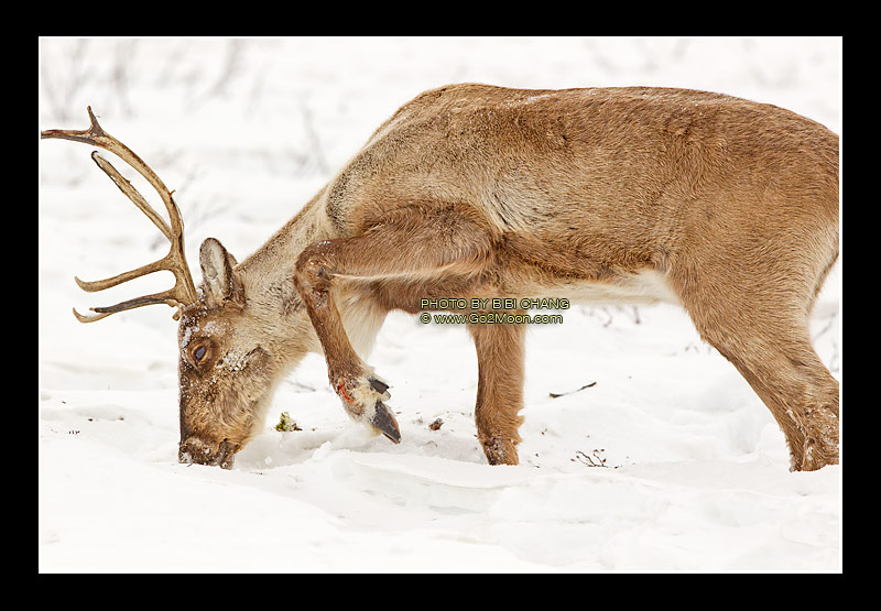 The Caribou has injured its front leg after digging the hard packed snow for days on end