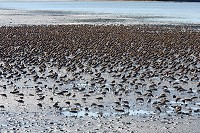 Thousands of Sandpipers rest on the beaches of Cordova at low tide, covering the ground