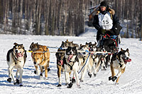 Musher Bob Storey is from Aukland, New Zealand. At age 65, Bob is participating in his first Iditarod. Unfortunately, Bob had to drop out of the race at Rainy Pass due to the condition of his dogs. |