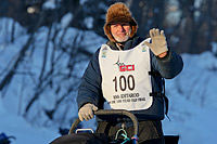 Dan Seavey, wearing bib #100 symbolizing the 100 years of the Iditarod trail. At age 74, Dan has competed in many Iditarods, including the inaugural